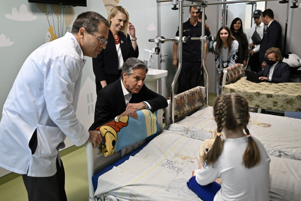 8 сентября, в понедельник Энтони Блинкен был замечен в детской больнице «Охматдет», куда он приехал с миссией, чтоб проведать детей, которые пострадали от агрессии рф. Во время визита в городскую больницу, Энтони подарил 6-летней девочке мягкую игрушку, девочка приехала в больницу вместе с родителями из оккупированного Херсона.